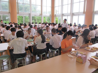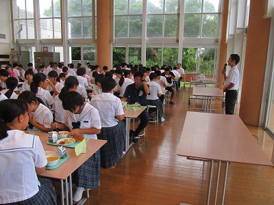 部活動ごとに集まり、交流給食を実施しました。写真は、中体連空手に出場した生徒が、結果の報告をしているところです。