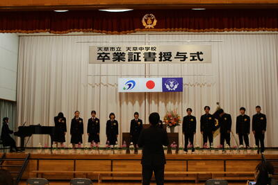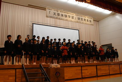 文化発表会で披露した3年生の「友~旅立ちの時~」と全員合唱の「郷愁歌」を天草市民センターの場で発表しました。