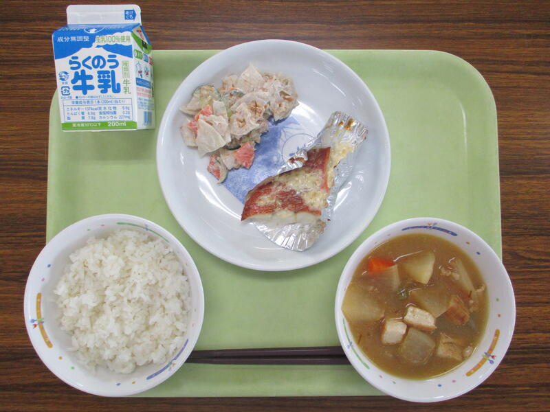 牛乳 麦ご飯 魚のタルタル焼き れんこん梅マヨサラダ 大根と鶏肉のごま味噌煮
