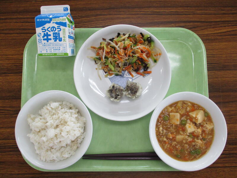 牛乳 麦ご飯 ひじきシューマイ 麻婆豆腐 中華和え