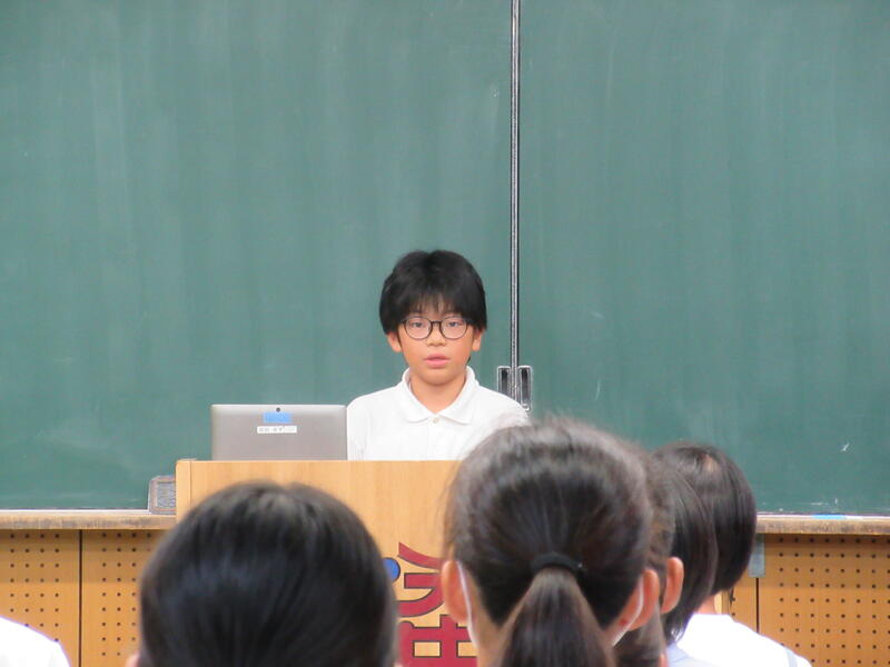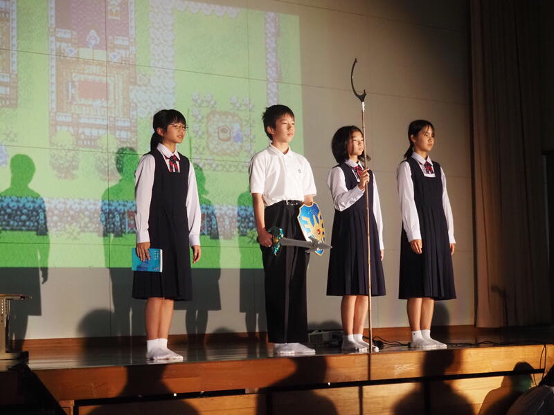 2年生は、修学旅行で行った大阪・関西万博で学んだことについて笑いあり、映像ありで、劇仕立てで発表しました。表現や演出など工夫してあり、修学旅行に行っていない私たちでも、まるで万博会場にいるかのような雰囲気を感じさせて入れる、そういうものが伝わる劇でした。