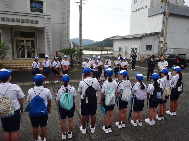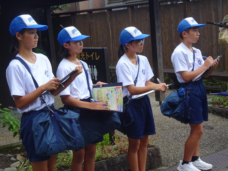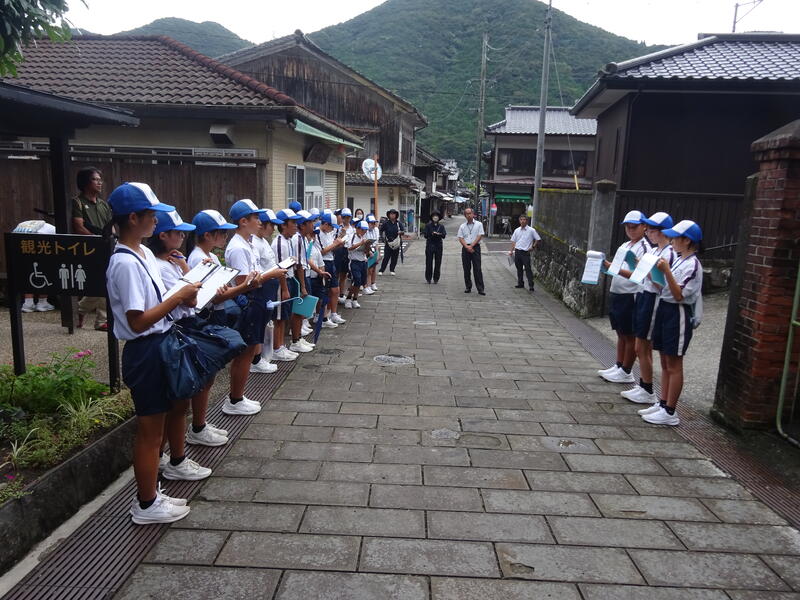 当日は、河浦中学校1年生のみなさんから﨑津集落や﨑津教会等についてガイドをしてもらいました!天草中学校1年生のみなさんは、感心しながら同じ学年の生徒たちの説明を聞いていました。ガイドしてもらった後は、今度は天草中の生徒から、ロザリオ館など天草町について調べてまとめたパンフレットをお渡ししました。