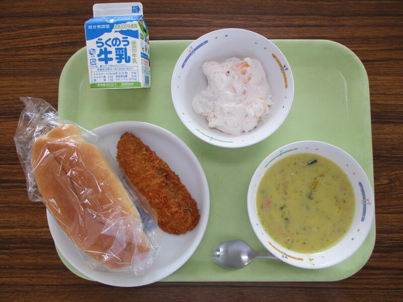 牛乳 コッペパン 白身魚フライ かぼちゃのポタージュ フルーツクリーム