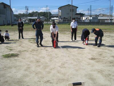 運動場に避難した後は水消火器を使った「消火訓練」、室内に移動して、部屋の中に煙が充満した中を逃げる「煙霧体験」を行いました。