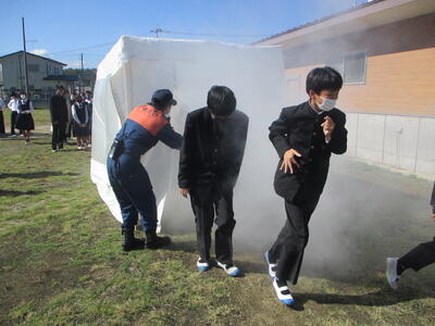 運動場に避難した後は水消火器を使った消火訓練、テントの中に煙が充満した中を逃げる煙霧体験を行いました。