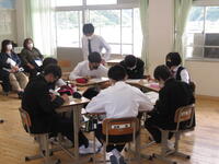 給食センターで調理をしたり、教室で一緒の給食を食べたりしました。