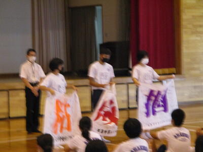 健康体育委員長からもあいさつがあった後、紅白の各応援団長に団旗が授与されました。