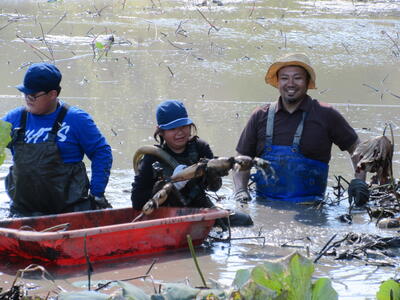 天草ロータスガーデンの岩下様のご協力により、1年生が1次産業体験、レンコンの収穫にチャレンジしました。