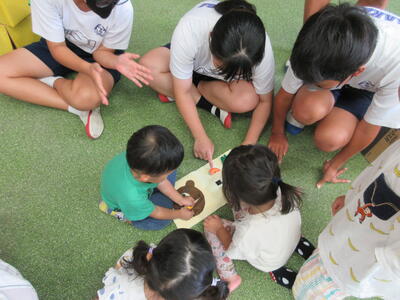 はじめにお互いに自己紹介をし、紙芝居をしたり、ゲームや自分たちで作ったおもちゃを使って楽しみました。