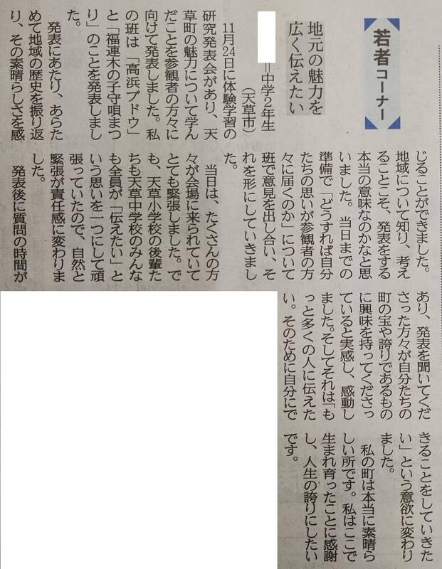 熊日新聞12/16朝刊に先日の「天草体験学習」研究発表会についての2年生の感想が掲載されました。