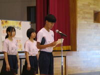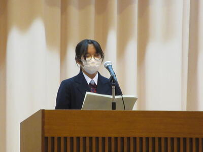 はじめに第42回全国中学生人権作文コンテスト熊本県大会で優秀賞熊本地方法務局長賞を受賞した生徒の作文発表がありました。