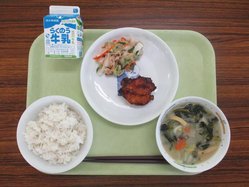 牛乳 麦ご飯 ピリ辛から揚げ 大根のツナ和え 冬の野菜みそ汁
