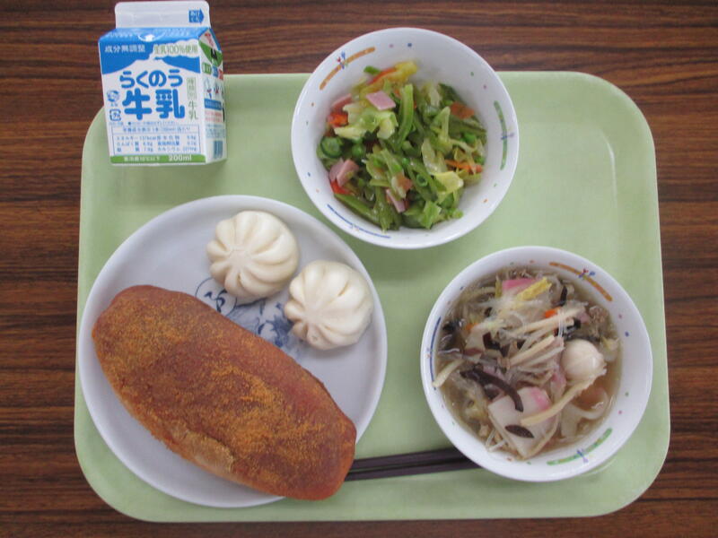 牛乳 揚げパン ミニ肉まん スナップエンドウサラダ タイピーエン