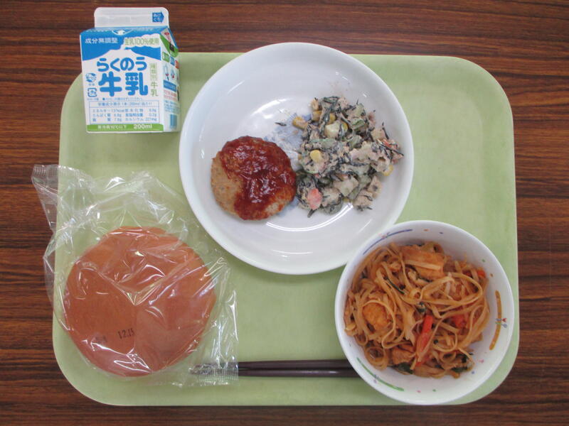 牛乳 丸パンカット ハンバーグ ひじきポテトサラダ パッタイ風焼きそば