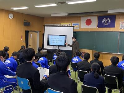 その後の職員講話では事務職員の浜﨑先生から読書のすすめとして、3冊の本が紹介されました。生徒はそれぞれ興味を持った本を発表してくれました。