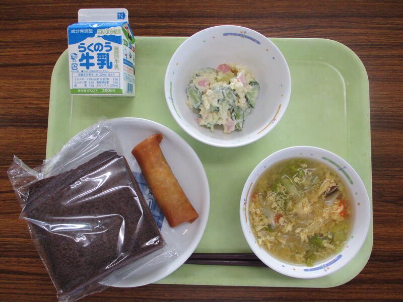 牛乳 ココアパン 春巻き ポテトサラダ レタススープ