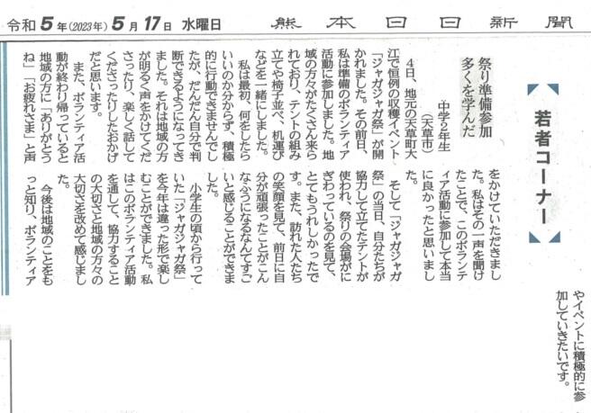 5/17付熊日新聞の読者の広場・若者コーナーに本校の生徒の文が紹介されました。