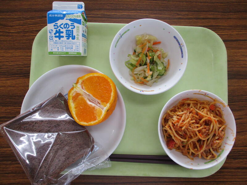 牛乳 ココアパン ミートスパゲティ サラ玉和え デコポン