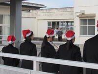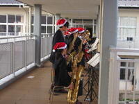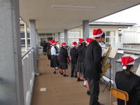 12月23日の放課後に、吹奏楽部がクリスマスコンサートを開催しました。本校の2階の渡り廊下から演奏し、ちょうど下校していた生徒たちは昇降口を出たところで立ち止まり、吹奏楽部の演奏に聞き入っていました。中には演奏に合わせて踊り出す生徒もおり、短時間ではありましたが、楽しい時間を過ごすことができました。吹奏楽部の皆さん、お疲れさまでした。