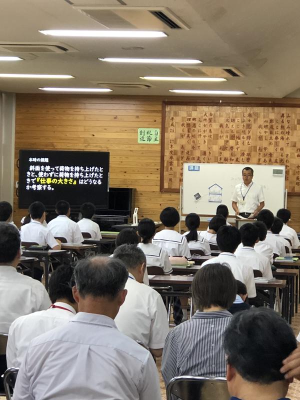 動滑車を使った実験などを行い、仕事について学びました。本日(6月7日)、3年3組で八住先生の理科の研究事業が行われました。小学校中学校の理科の先生方が40名近く来られ授業を参観されました。