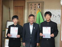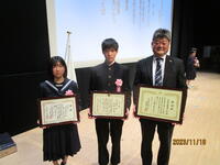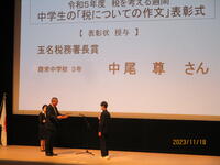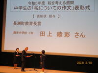 11月18日(土)玉名市民会館において、税の作文表彰式が行われました。玉名税務署長賞に中尾尊さん、長洲町教育長賞に田上綾彩さんが入賞しました。学校賞として腹栄中学校は感謝状を頂きました。