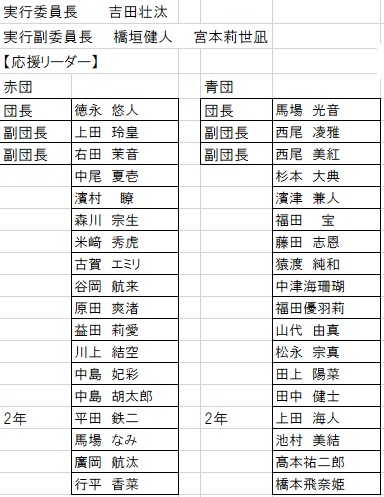 スローガンは、「飛翔~走れ 昇れ 頂点へ!~」、赤団団長が徳永悠人さん、青団団長は馬場光音さんです。