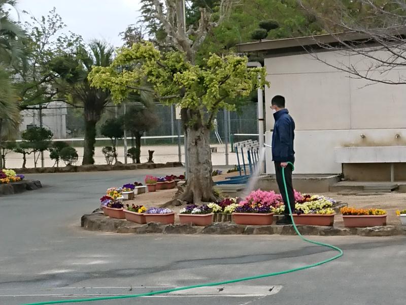 生徒の皆さんが毎日水かけや草取りをがんばってキープしていたきれいな学校を、学校再開まで維持できるように、先生たちも在宅勤務と並行しながらがんばっています。生徒の皆さんは、学習や適度な運動等をがんばってほしいと思います。