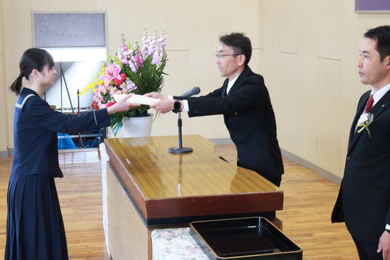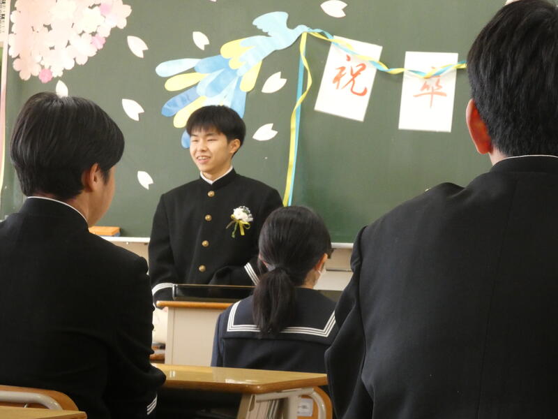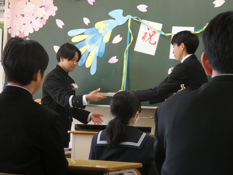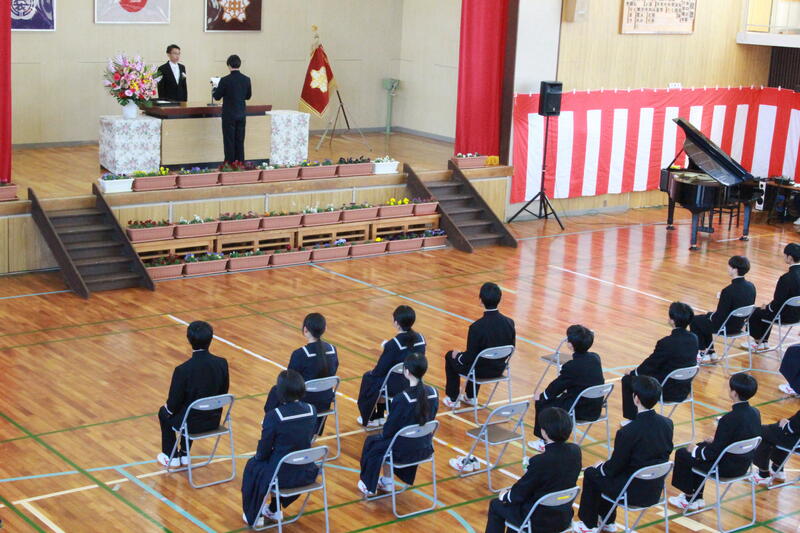 3月8日(日)に「令和7年度 第79回卒業証書授与式」を行いました。卒業生は、保護者や地域の方、来賓の方に見守られながら、卒業式を終えました。その後の最後の学活では、担任の先生から一人ずつへのメッセージと卒業証書を受け取り、仲間や保護者に今までの感謝の気持ちを伝えました。