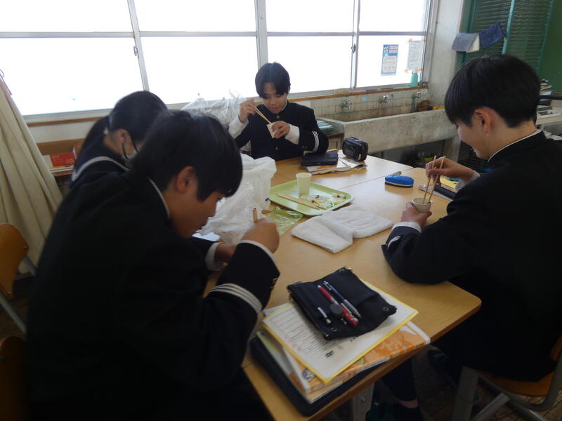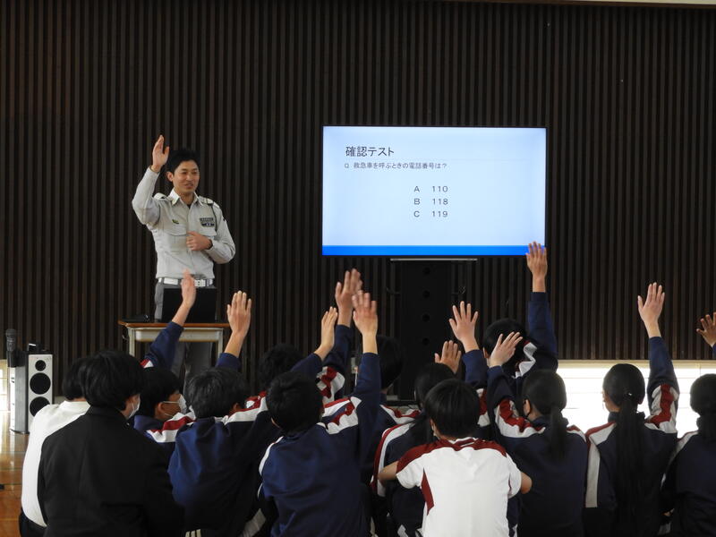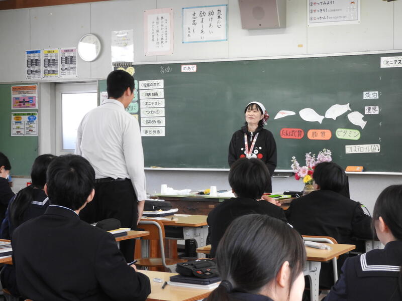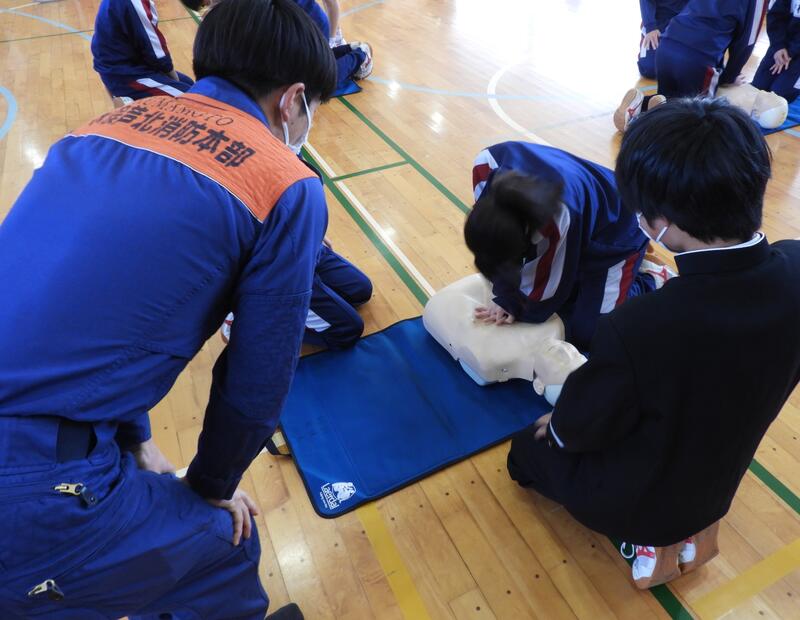 3月13日(金)に授業参観と学年保護者会を行いました。2年生の体育科の授業では、救急救命について、水俣葦北消防本部の方を講師にお招きし、救命講演会を行いました。生徒たちは訓練用の人形を使って心臓マッサージを行い、AEDの使い方を学びました。1年生の家庭科の授業では、料理に使う出汁の重要性について学びました。まず味噌だけを溶かした味噌汁をひとくち飲み、そこへ鰹節や鯖節を加えまぜて飲むという体験を通して、出汁の重要性を理解しました。