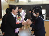3月27日(金)に退任式を行いました。今年異動される先生は、荒川校長先生、大塚先生、平野先生、田上先生の4名、退職される先生は、南先生の1名です。先生方はそれぞれ生徒との思い出や生徒へのメッセージを話されました。その後、生徒代表が先生方への感謝の言葉を述べ、生徒会執行部からお花を渡した。異動・退職される先生方、これまでのお勤めお疲れさまでした。新天地での益々の活躍をお祈りいたします。