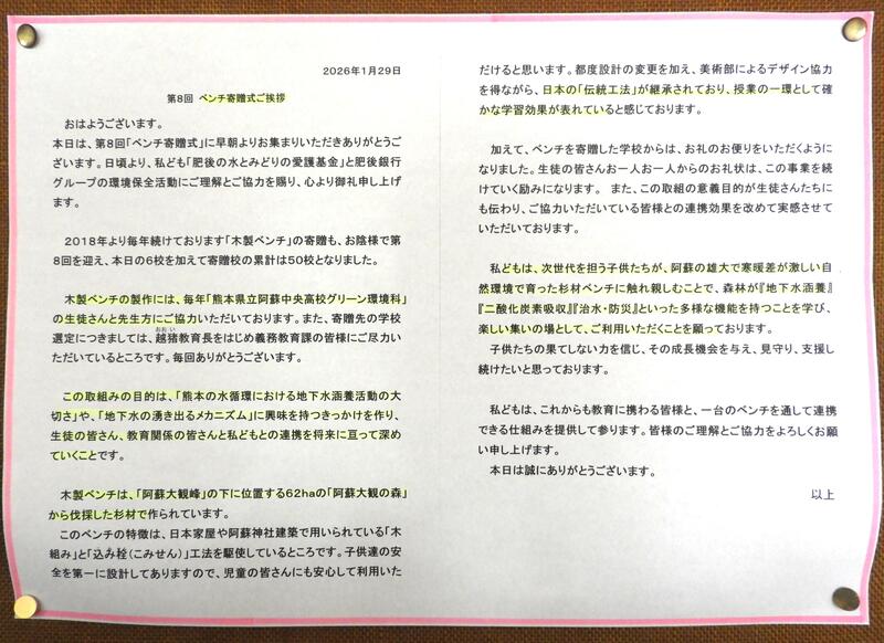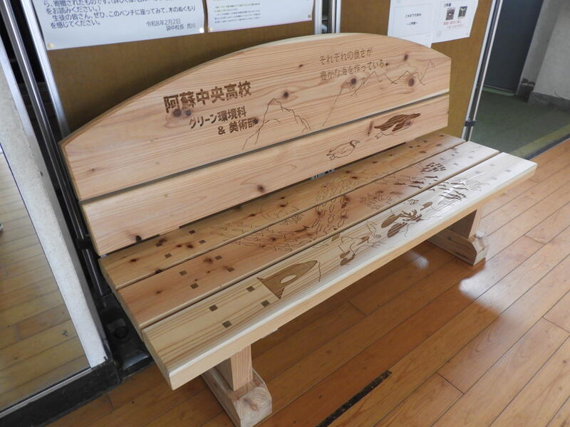 「肥後の水とみどりの愛護基金」様から木製ベンチの寄贈がありました。こちらのベンチは熊本県立阿蘇中央高等学校グリーン環境科の生徒さんが、地元阿蘇の木を使って作られました。このベンチに込めた想いが記載された基金様からの挨拶分も掲載していますので、ご覧ください。