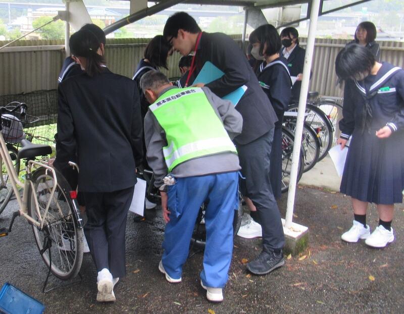 交通安全教室・自転車点検 投稿日時 : 04/27 承認者 4月13日(月)の3時間目に、自転車安全点検と交通安全教室を実施しました。ここ数年、八代市内でも自転車の事故が増えています。特に自転車通学を始めたばかりの1年生は、車にも歩行者にも十分気をつけましょう。また、この日は黒川自転車店の方にも協力いただき、ブレーキやライト等の点検も行いました。