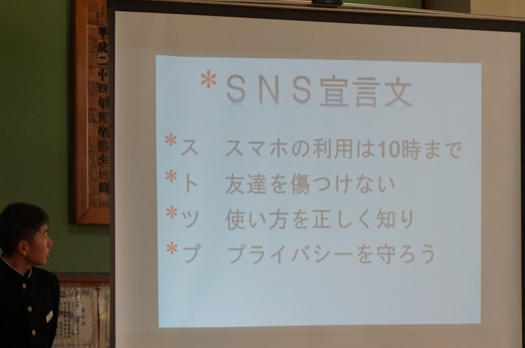 生徒会が「SNS宣言文」を作成し、全校生徒で読み上げ、採択しました。