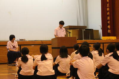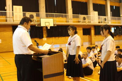 まず始めに、恐竜の絵コンテストの表彰が行われ、本校から2名が表彰されました。そして、夏休みの反省と2学期の抱負を各学年の代表が発表しました。2学期は期末テストに始まり、全員合唱、校内マラソン大会、生徒会選挙など学校行事、地域の行事ももり盛りだくさんです。それぞれもの目標が達成できるように一日一日を充実した2学期になることを願っています。