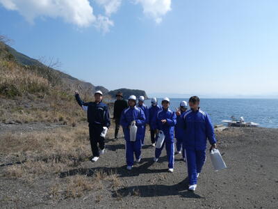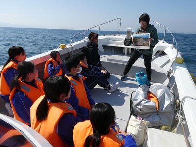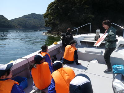1年生は天草自然学習として、船に乗って白亜紀の壁を訪れ、化石採取体験を行いました。
