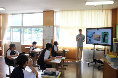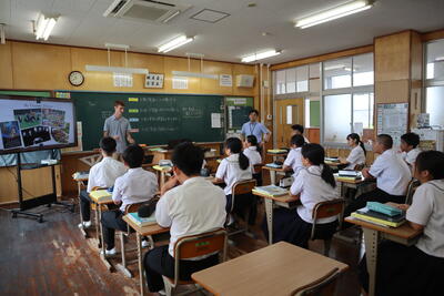 その後の授業では、セオドア先生ご自身の自己紹介に加え、出身地であるアメリカ・シカゴについて、写真を交えながら分かりやすく紹介してくださいました。生徒たちは興味深そうに耳を傾け、英語でのコミュニケーションへの期待も一層高まったようです。