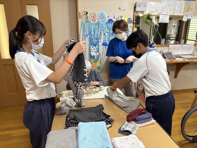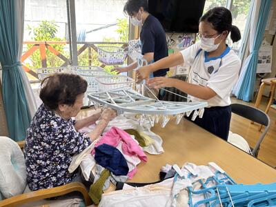 ワークキャンプでは、御所浦町の高齢化の現状や地域課題についての学びを深めた後、お年寄りとの交流活動を行いました。生徒たちは、一緒にレクリエーションを楽しんだり、会話をしたりする中で、相手の笑顔にふれ、自分たちにもできる地域貢献のあり方について考える貴重な時間を過ごしました。