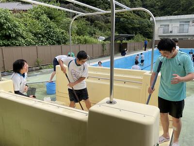 6月7日(水)プール掃除でした。これから水泳の授業が始まります。自分達で使うプールをみんなで丁寧に掃除しました。水が溜まって泳げるのは来週以降になりそうです。スタートは真剣な表情でこれから掃除に向かう様子でしたが・・・・、しばらくすると・・掃除を頑張った結果として濡れたのか。濡れることが第一の楽しみで、そのついでに掃除したのか?・・・写真から感じ取る雰囲気では・・・うーーん!ビミョーです。