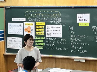 3年生は、福本先生のT1指導で行いました。「説明するスキル~上級編~」でした。「相手や場面に応じて、伝えたいことを的確に説明できるようになる」について学習しました。相手によって使い分ける、明るいトーン、早口にならない、わかりやすい資料 などの意見が出た一方、先生のモデリングに対して、「悪い例では先生の感情がなかった。」「滑舌が悪かった」など生徒たちの厳しい指摘もあり、みんなの笑いで雰囲気の和む場面でした。