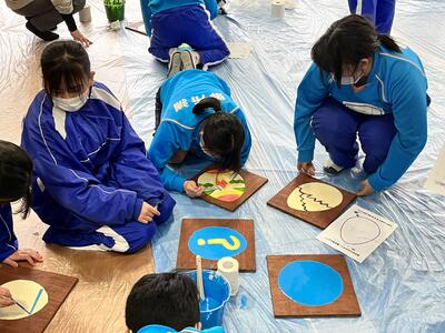 3月12日 思い思いの恐竜の卵を作成 ~御所浦博物館前の漁具倉庫壁に貼るパネル作成~