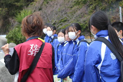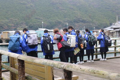現地では、町並みの特徴や建物の工夫、海とともに生きてきた人々の暮らしについて具体的な話を聞き、資料だけでは分からない気づきを多く得ている様子でした。生徒たちは、メモを取りながら真剣に話を聞き、自分の探究テーマと結び付けて考える様子が印象的でした。