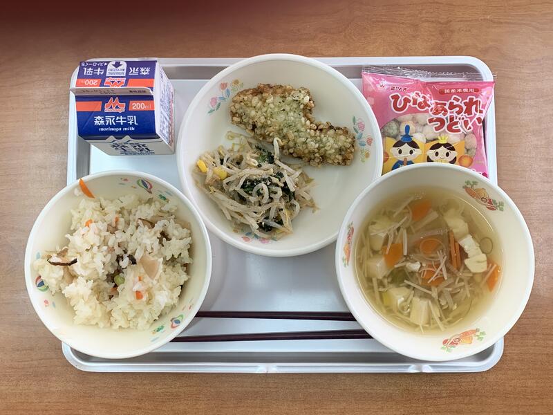 最後の給食:牛乳、ちらし寿司、とうふ汁、菜の花和え、ホキの天ぷら、ひなあられ