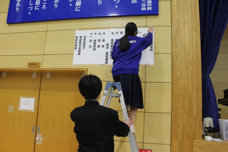 午後は卒業式に向けて1,2年生は式場の準備を行いました。明日3年生が気持ちよく巣立っていくためにもみんなの協力が必要です!
