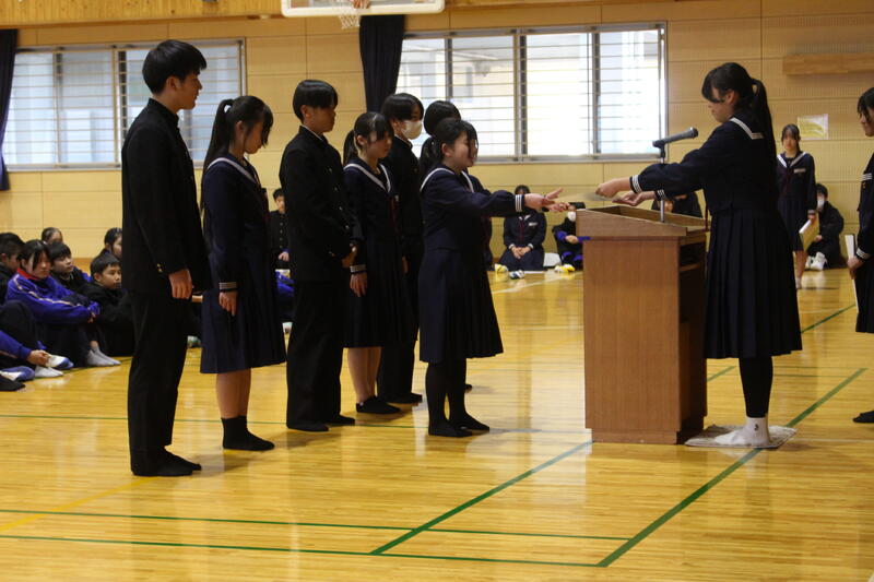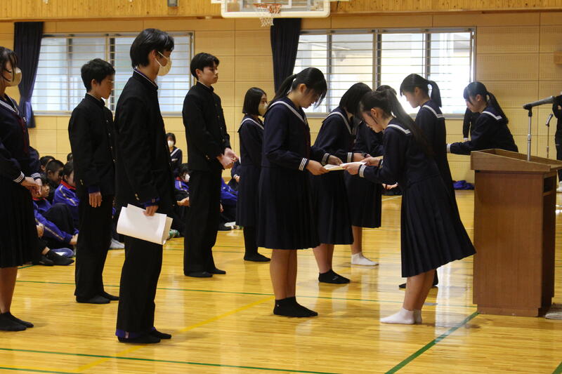 冬休み前集会:初めに生徒会三役に感謝状贈呈~1年間ありがとう!