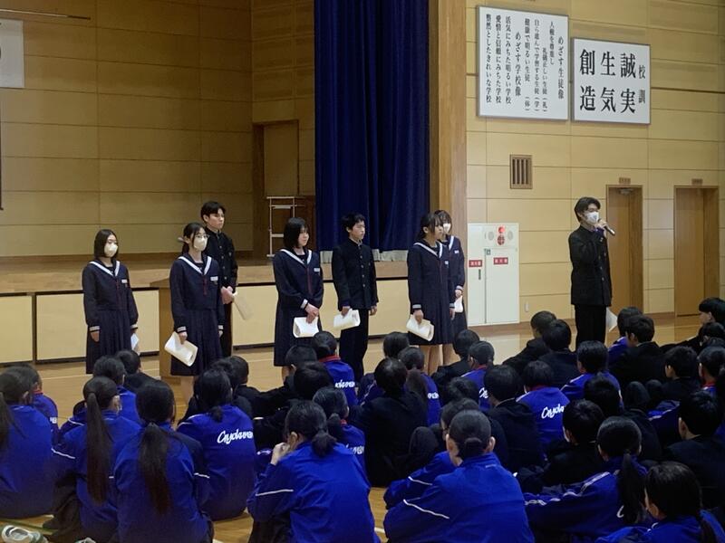 令和8年度の生徒会役員立候補受付が終わり、今日から10日まで選挙運動が行われます。今日も寒い中、立候補した皆さんは大きな声で呼びかけていました。演説会と投票は来週11日木曜日です。