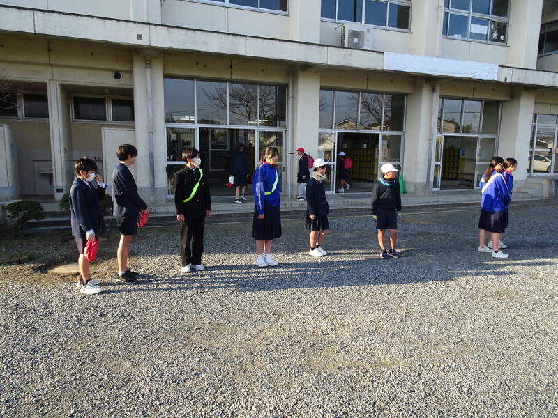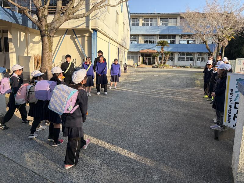 伊倉小学校玄関付近で小学生とともにあいさつ!