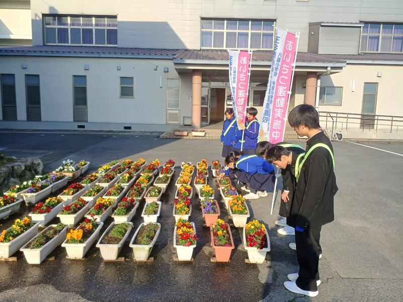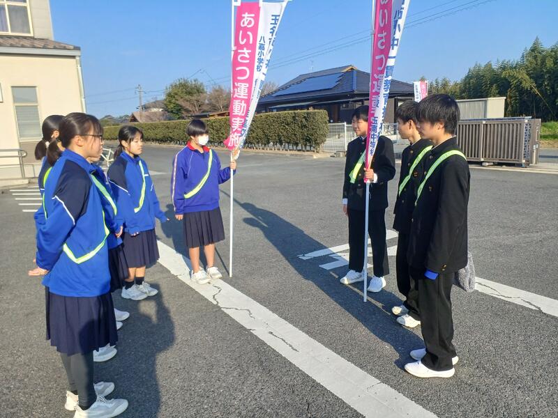 伊倉小学校玄関付近で小学生とともにあいさつ!