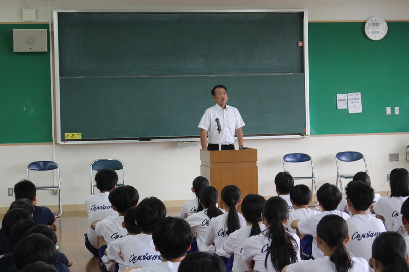 校長講話:①生徒意見発表を聞いて②夏休み玉南中生徒の活躍③大雨への備え④今後の学校生活⑤当たり前の質を上げよう…など