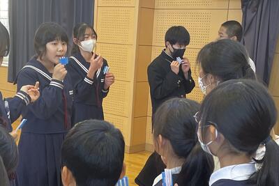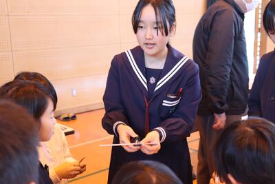 小学校体育館・中学校体育館の2会場で、中学校3年生が実験講師となって、5つの「おもしろ実験」を小学生と中学1・2年生に体験してもらいました。