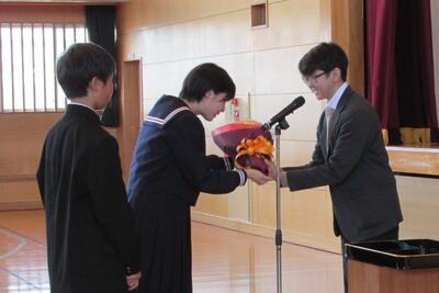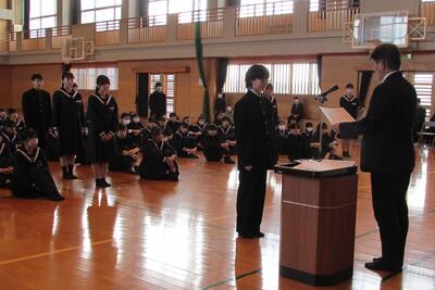 昨日(12月1日)、先日選挙で当選した生徒会の新三役に校長先生から任命書が渡されました。また、これまで生徒会をリードしてきた旧三役に、新三役から感謝状が渡されました。